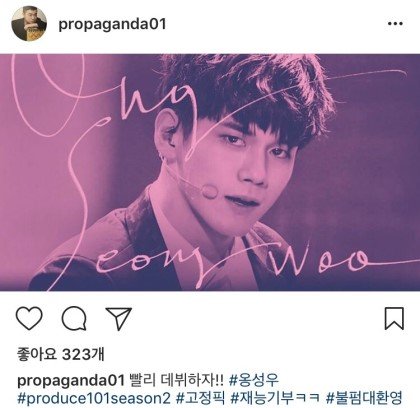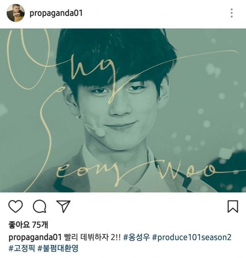 프로파간다 인스타에 옹성우 사진에 캘리그라피를 새긴 게시물이 올라옴. 빨리 데뷔하자고ㅋㅋ