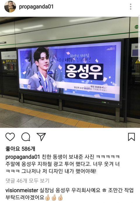 하루만에 프로파간다가 옹성우 지하철 광고 만들어주심..ㄷㄷ그것도 재능기부로..곧 광고 걸릴 예정이래.