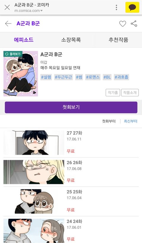 요즘 bl웹툰에 빠졋습니다. ㅠㅠㅠ최근에 새롭게 보는 웹툰인데 오늘 하루 무료로 갑자기 풀렷네요얘네 너무 귀여워요 ㅠㅠㅠㅠㅠ 무료니깐 한번씩들보세요~~ㅎㅎㅎ