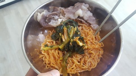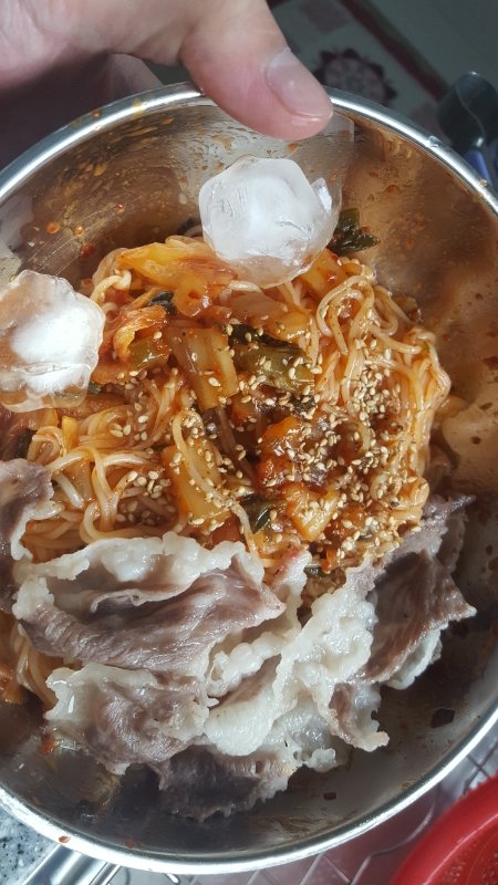 레시피 : 비빔면 봉다리 써있는대로 끓이고 후라이팬에 차돌박이 살짝 익혀서 올렸어요. 삼겹살 올리고 싶은데 냉장고에 차돌박이 밖에 없네요.