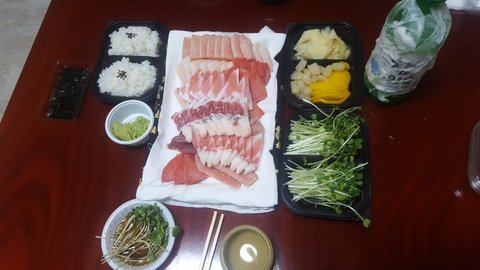 그렇게 참치를 찾다가...이건 요리한건 아니고 참치직판장에서 파는 도시락이에요. 사진른 2인분 5만원어치입니다. 정말 배불리 참치만 먹고싶을때 너무 좋아요....♡ 사장님 감사합니다.