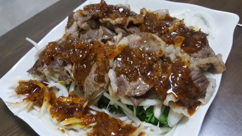 양파와 부추를 곁들였어요.. 소스는 된장+간장