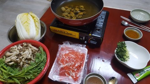 육수에 조개를 넣었는데 사실 필요없어요, 마트에 파는 샤브용 육수 쪼마난거 사서 넣으먄 끝임. 찍어먹는 소스도 다팔아요.