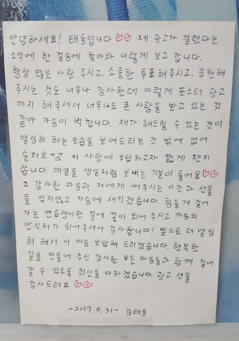 댓글보고 추가했어!! 그리고 후기보니까 세운이 팬들이 포스트잇 붙여준거에 하나하나 하트그려주고 갔데ㅠ팬이 사진보는데 자기가 썼던포스트잇에 없던 하트가 그려져있었다고함ㅠㅠ