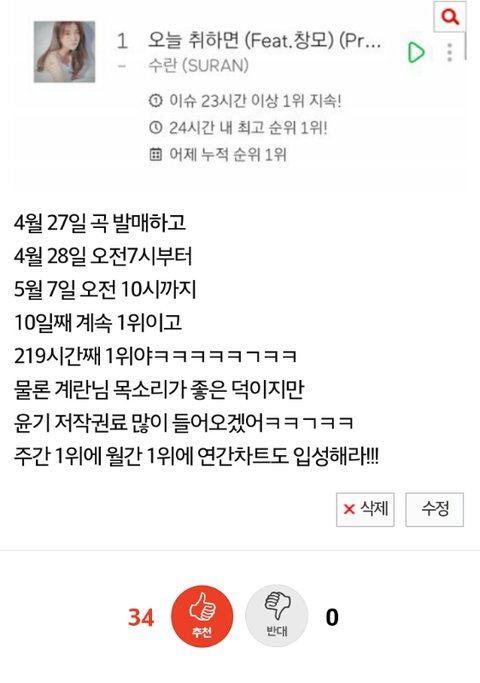 내가 오취 월간 1위하면 좋겠다고 했는데 말이 씨가 되었어!!! 진짜 윤기 뿌듯하겠다 이러다 나온차트시상식에도 나오시는건 아닌지 ㅋㅋㅋㅋㅋㄱㅋ 기대된다 같이 시상식 나오시면 좋겠닼ㅋㅋ
