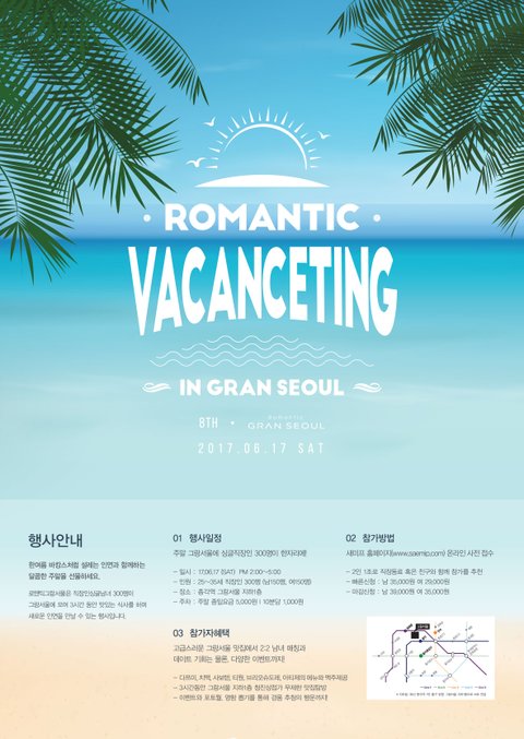 이번 이벤트 부제는 ‘로맨틱 바캉스팅 in 그랑서울’로 직장인 싱글남녀 150명씩 총 300명의 참가 신청을 인터넷 홈페이지(www.saemip.com)를 통해 접수받는다. 25세부터 35세까지의 싱글 직장인이면 누구나 참여할 수 있다.