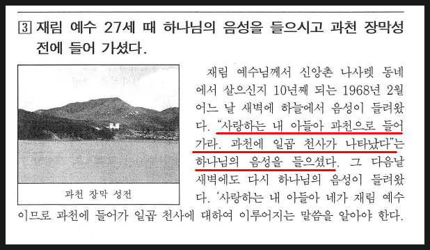 과천으로 들어가라"는 하나님의 음성을 들었다고 주장하는데, 마치 이만희 교주가