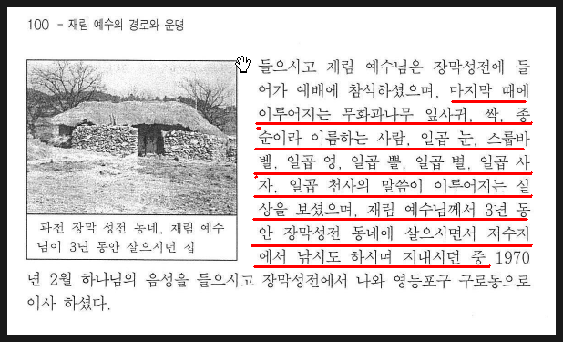 이 책에서 구인회교주는 27세이던 1968년 2월에 "과천에 일곱천사가 나타났으니