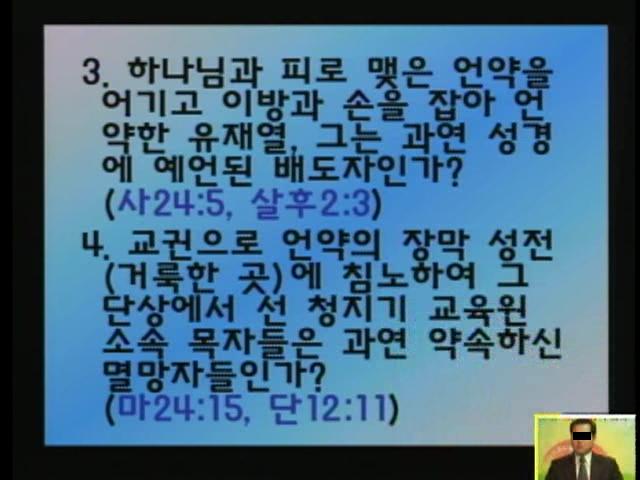 ↑ <신천지교육장의 개시록 실상강의에서 유재열씨를 배도자로 저주하는 강의동영상 캡쳐>