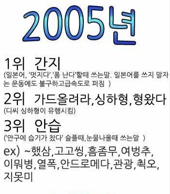 내가 정확히 6짤때 유행했던 말들이라는데....이거 전부 다 알고 사용하면 아재래.....근데 난 저중에서 두개빼구 다 알아.....나 아재니??ㅋㅋㅋㅋㅋㅋ 다들 몇개알아?