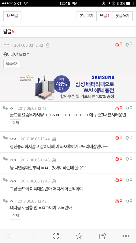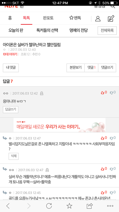 글삭하고 뒤에서 글쳐올렸네~^^진짜 싸운글 여기까지 쳐가지고 올리냐ㅉ진짜 찌질하게 살지마 거기서 끝낼일은 또 나오게 만들고 그냥 너가 이긴걸로 해줄게ㅉㅉ진짜 찌질하게 산다ㅉ