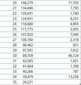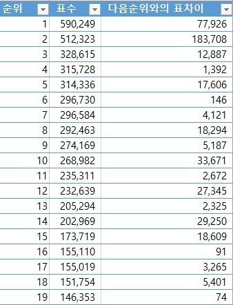 20위권은 모든 순위 표차가 2만표가 넘어간 적이 별로 없음