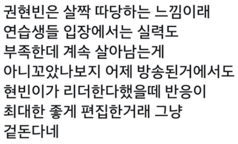 권현빈이 제일 핵인싸 같던데 두루두루 다 친한ㅋㅋㅋㅋ동생이랑 있으면 현빈이 팔은 동생들 팔짱껴주느라 바쁘고 형아들이랑 있으면 어깨동무 하느라 바쁨ㅋㅋㅋ방송봐도 제일 다양한 연습생들이랑 껴앉고 있던데 그리고 진짜 따였으면 굳이 쏠쏠2조 애들이랑 방송도 아닌데 사적으로 따로 만나고 그랬을까