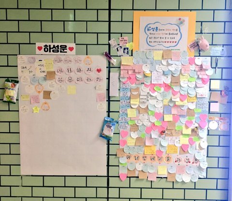 전광판에 성운이가 쓴 메모지 빼고 다 저 게시판에 빼곡히 적혀져있음..ㅎㅎ 팬들이 서로 먹으라고 꿀이랑 사탕이랑 젤리랑 초콜릿 가져다놓고..스윗걸즈구름단...