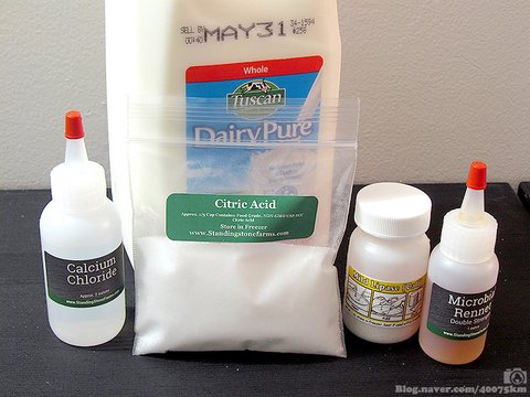 구연산, 염화칼슘, 리파아제, 렌넷 등 이름도 처음 들어보는 괴상한 물건들이 필요하지만 치즈 제작 용품 파는 곳에서 한 번에 다 구입할 수 있습니다.