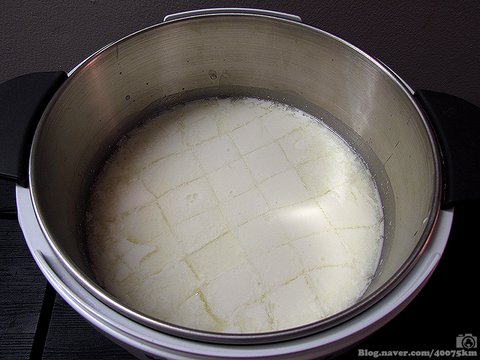 유청에 소금을 넣고 85도까지 뜨겁게 가열합니다.
