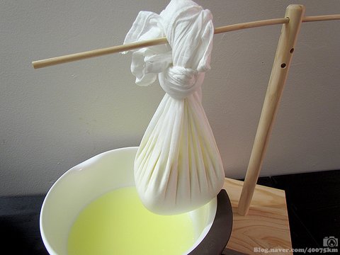 38도에 도달하면 우유 덩어리를 잘 섞어서 부순 다음, 면보자기에 담아서 수분을 제거합니다.