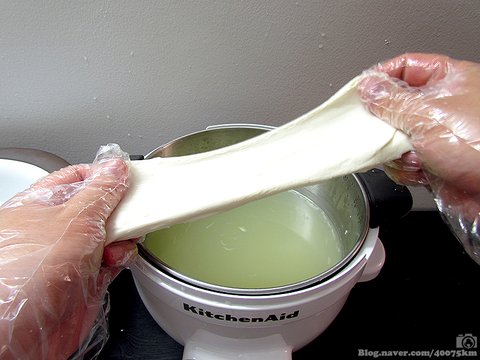 어느 정도 치즈가 부드러워지면 꺼내서 손으로 쭉쭉 늘리는 스트레칭 작업을 해 줍니다.