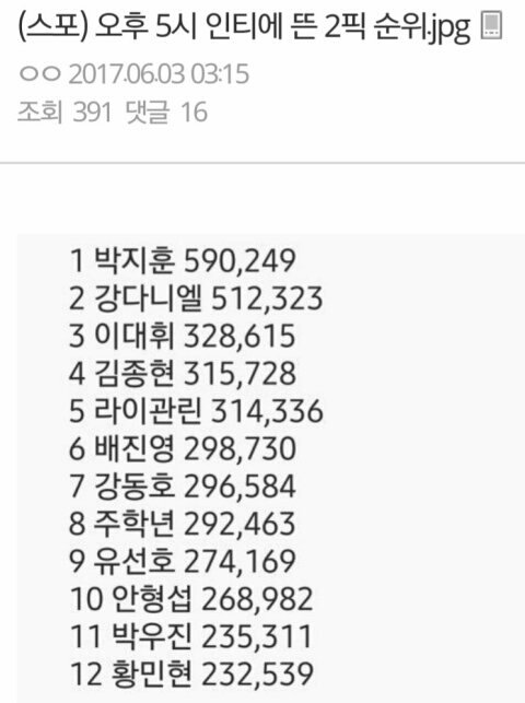 나 안그래도 네버 순위보고 멘붕 1차오고 17위 득표수 보고 2차 충격받았는데 거기다가 스포 2픽 현재 순위 돌아다니는데 거기 옹 없는거보구 정말 굉장히 완전 리얼 헐 충격받았었어.(참고로 글 맨 밑에 스포 순위있어)