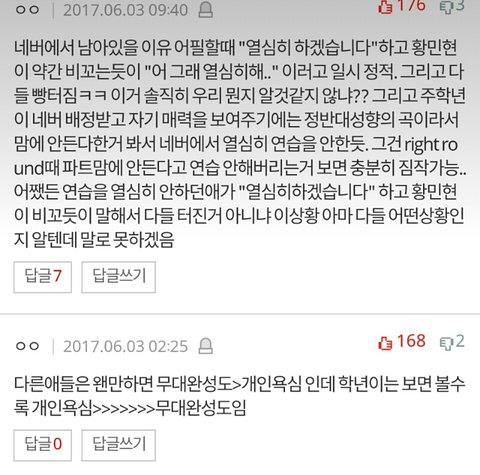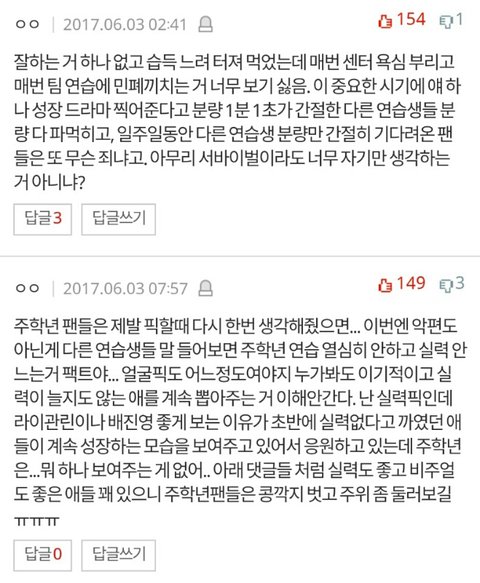 일단 톡선에 주학년 당신 춤 너무 잘 춰? 였나 안무실수한부분들을 다 움짤로 만들어서 글을 썻더라고 물론 실력 안좋은거 인정하고 잘하지도 못하면서 센터 다시 바꿀까? 한것도 잘못한거 맞아 근데 주학년이 연습 열심히안했다는 증거는 어딨어? 판에서 까이는 글들보면 거의 대부분의 댓글은 잘못한점이 아닌 인신공격이잖아 그만했으면 좋겠단의미로 썻어