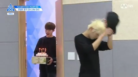 진실은 제작진 몰카!최민기 연습생이 의도적으로 생일 주인공 박지훈 연습생을 화나게하고 자신도 화난척하며 문을치고 나가 사실은 생일케익 가지러 나가는 반전 드라