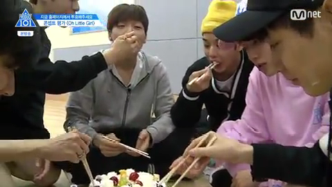 그뒤에있는 이건희 연습생이 생일케익을 들고 미온수 최민기가 먼저 생일노래를 부른다!