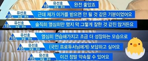 연습생 생활 오래한 애도 아니고 댄스 포지션도 아니고 심지어 중간에 조 옮겨서 연습기간 반토막 났는데도 저정도로 하는데 도대체 실력으로 왜 까는거임? 한번도 실력으로 팀에 민폐 끼친 적도 없고 한사람분량 충분히 하는 애한테 욕좀 그만해