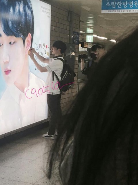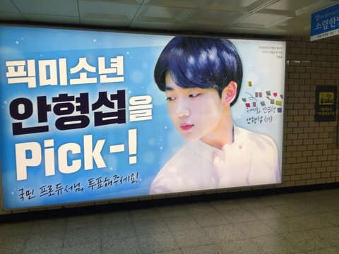 건대 지하철역에 걸려있는 형섭이 픽미소년 광고! 팬들이 광고에 형섭이에게 전하는 메세지 포스트잇들 붙이고 성지순례하는 장소였음