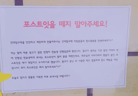 광고판 손상되지 않게 그 옆 벽에 자리를 마련해서 팬들이 관리하고, 매일 밤에 그날 달린 포스트잇들을 수거해가기로 함ㅠㅠ