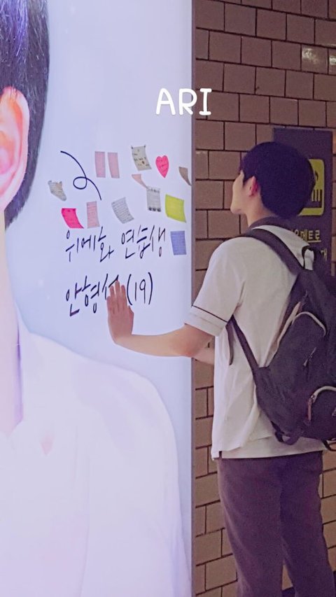 광고판에 팬들이 남긴 포스트잇 편지들 읽는 모습..