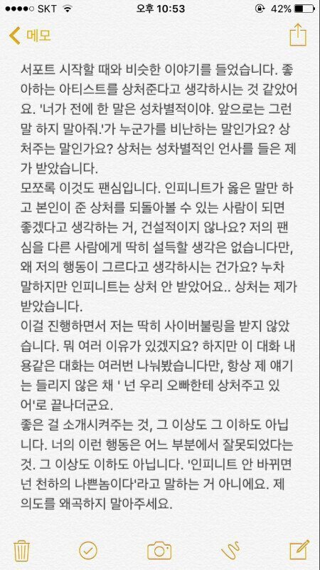 애들은 공인이라 여기저기서 욕 먹은 사건인데 그걸 자기가 상처받은건 더 크다고 말하는 것 봐 팬 맞냐 탈덕해라 진짜 인슾이면 그것때문에 성규 무대에서 웃지도 못 했는데 어떻게 그걸보고 상처를 안받았다고 말할수있어?쟤네들이 인피니트도 아니고 어떻게 알아 그걸 진짜 어이없네ㅋㅋㅋㅋㅋㅋ