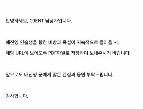 요즘 배진영 욕하고 견제하는거 엄청많던데.. 특히 판이^^ 앞으로 그런글있으면 pdf 따서 c9entstaff@c9ent.co.kr 로 보내줘 메일도 상관없고 진영이 아무이유없이 욕하던애들 꼭 고소길만 걸어~