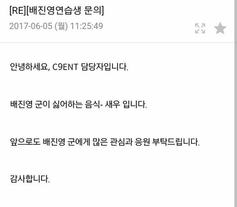 는 배진영 소속사 씨나인ㅋㅋㅋㅋㅋㅋ 어떤팬이 문의했는데 싫어하는음식 새우라고 답장옴ㅋㅋㅋ ㄹㅇ웃김ㅜ 저런거까지 알려주고ㅋㅋㅋㅋ 진영이 새우알레르기 있어서 그렇다는데ㅋㅋ
