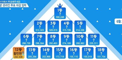 3등~14등 잘보셈. 1,2등 제외하고는 순위 다 비슷비슷 해서 언제든지 뒤집힐수 있을것 같지않음..? 이제 남은화 분량 누가 잘나오는가에 따라서 순위 뒤집힐것 같음. 그니깐 데뷔확정 된 앤 아직 아무도 없음ㅇㅇ