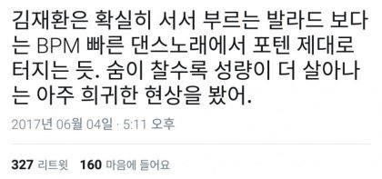 나는 재환이 롹 언제 제대로 부르는거 듣고싶어 완전 잘어울릴거가테 ㅜㅜ