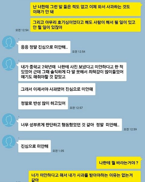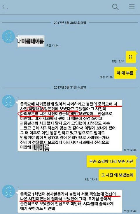 쟤가 내 전신사진에서 다리 부분만 잘라서 익명채팅어플에 내 다리사진을 한번도 아니고 몇번씩이나 보냈고 몇년전에 보낸것같아ㅇㅇ 이제 졸업했고 학교도 다르니까 얼굴 볼 일은 더더욱 없고 그래서 지 죄책감 덜으려고 카톡으로 대충 사과한듯 너무 화나는데 뭘 어떡해야될지 모르겠어 조언 들으러고 여기 글 써봤어