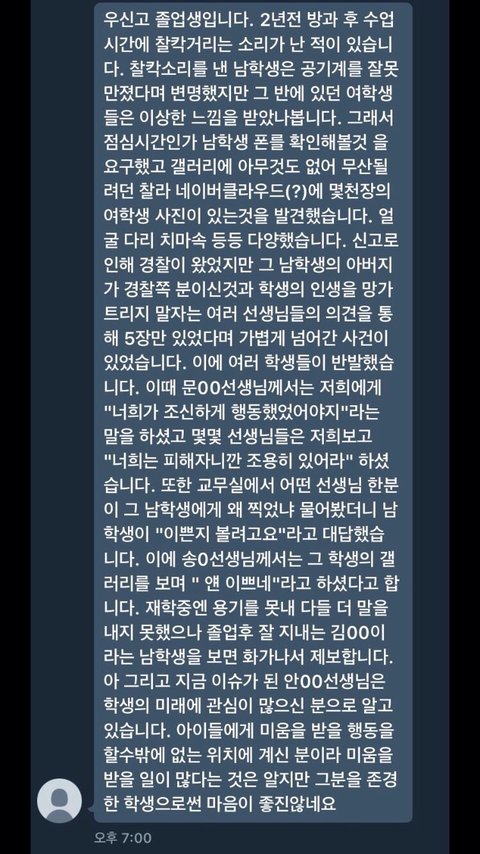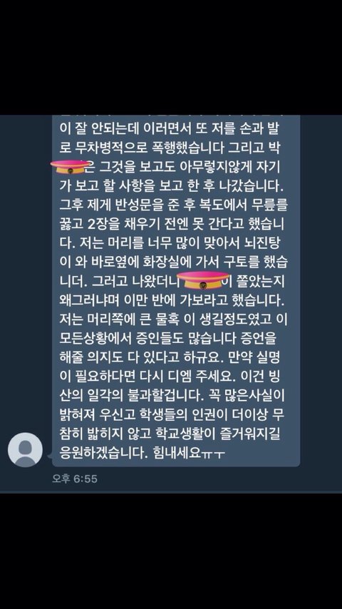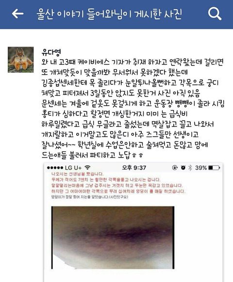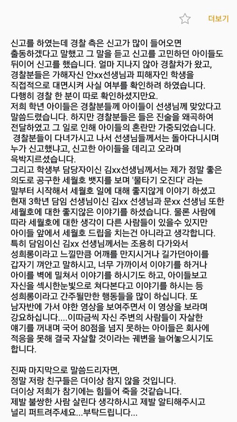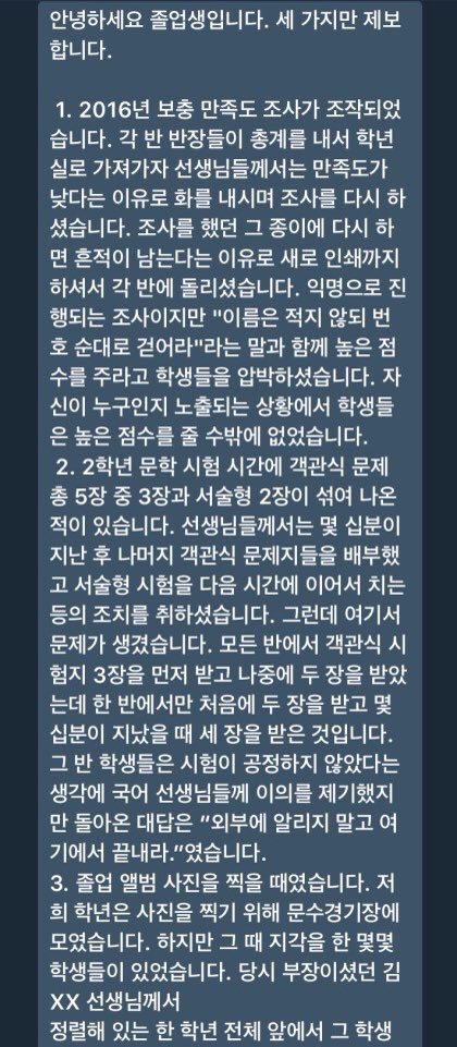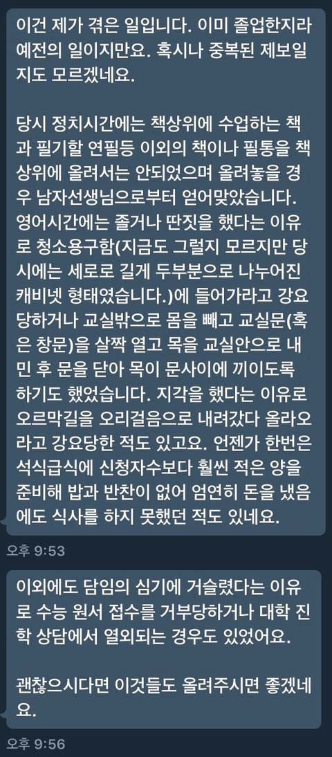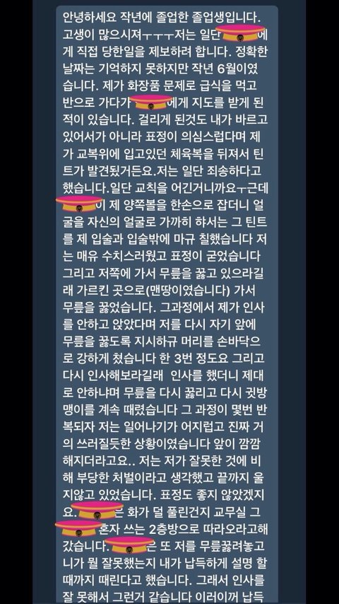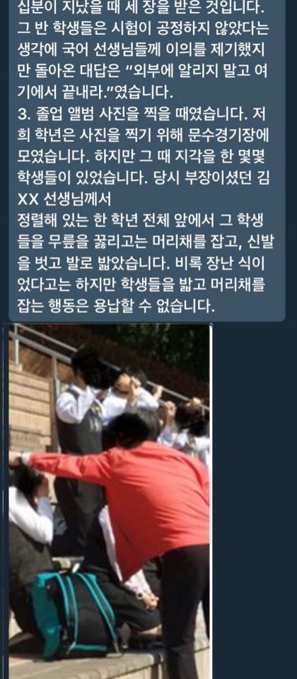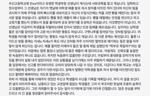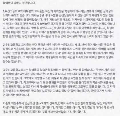 안녕하세요 우선 전 우신고 재학생 및 졸업생이 아님을 밝힘니다 우신고 재학생과 졸업생이 아님에도 이렇게 글을 올리는 사람이 생긴 만큼 우신고등학교 교권남용이 공론화 되고 있다는 사실을 알아주세요 우신고 학생들을 도와주세요 울산 우신고 학생들은 선생님들의 교권남용으로 끝없는 인권 침해를 당해오고 있습니다 제발 공유해주세요 고통받는 우신고 학생들을 도와주세요 사진이 열두개 밖에 첨부가 안돼서 다 자세한 사례들은 이 글을 참고해주세요 http://naver.me/5bbG9DEn 있을 수 없는 일이라고 생각합니다 더이상 졸업생들이 받았을 고통과 재학생들이 받고 있는 고통이 대물림 되지 않게 해주세요 재학생들이 더이상 고통받지 않게 해주세요 언제까지나 눈가리고 덮을 수 없는 사건입니다 긴 글 읽어주셔서 감사합니다..