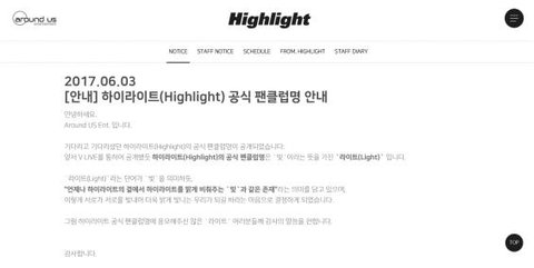[앞서 V LIVE를 통하여 공개했듯 하이라이트(Highlight)의 공식 팬클럽명은 `빛`이라는 뜻을 가진 `라이트(Light)`입니다.