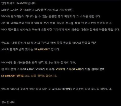 빅스가 별빛이라는 말을 많이 사용하기에 STARLIGHT은 공식 팬덤명인지 모르는 분들도 있을 수 있지만. 별빛이든 모두 빅스의 팬덤명이라고 할 수 있습니다.
