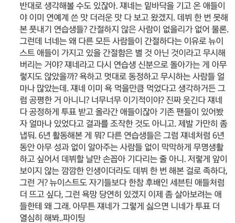 한번만 반대로 생각해보면 어떨까. 물론 간절하지 않은 연습생은 없겠지만, 플디즈 애들 중3때 지방에서 서울로 올라와서 3년동안 연습하고 18살이라는 어린 나이에 데뷔해서 6년간 실패만 해본 애들이야. 해체 위기를 앞두고 이뤄낸건 없고 앞으로 계약 끝나면 뭘해야할지 얼마나 깜깜했을까. 마지막 도전으로 모든 걸 내걸고 프듀에 나왔는데. 너네가 과연 이런 애들한테 돌을 던질 자격이 있을까?
