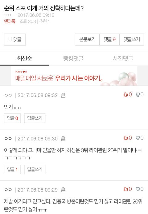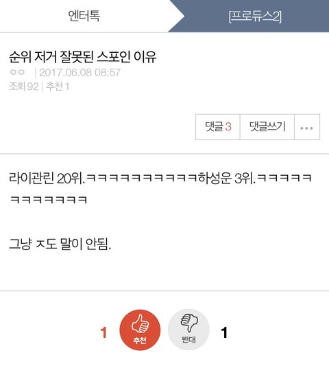 야 적당히 해라 너만 기분 뭣같은거 아니거든? 하성운 쭉 A반이였고 분량이 첨에 적어서 주목 못 받고 소나기로 간신히 인기얻은다음 네버춤 춘 이후로 팬 좀 많이 생겼다... 근데 아무리 스포라고 해도 니픽이 11명 뽑을때 순위가 상위권이면 견제픽 아니고 달랑 2명 뽑는데 성운이가 순위가 오르면 견제픽이냐? 그리고 니들이 뭔데 자꾸 얘는 데뷔 못함 얘는 데뷔하면 안된다를 판단하냐? 판단은 국프가 하는거야!! 성운이가 뭐 니들픽 들러리 될려고 나왔냐? 우리는 얘 처음부터 20위 밖이였으니까 니네가 현실적인 순위 아니다 뭐 그러면 어 그러네 우리가 미안해 이래야 되냐? ㅅㅂ 가만히 있으니까 ㅈㄴ 아주 사람을 ㅂㅅ으로 보더만... 적당히 해 진짜 남깎아내릴 시간에 너 픽 연습이나 시키고 영업질이나 해라 그리고 관린이 팬코 하지마 ㅅㅂ