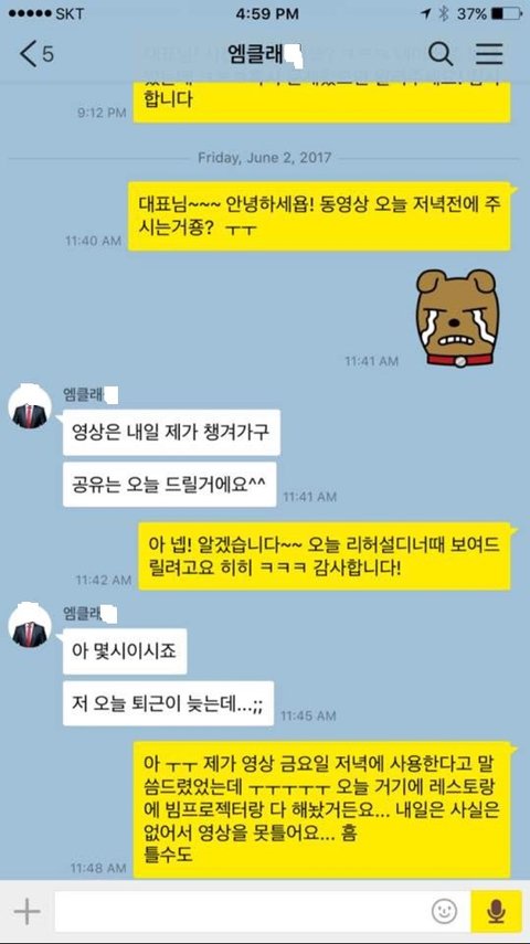 동생: 누나랑 카톡하신거 다 봤는데 연락도 안되시고 어떻게 영상을 오늘까지라는데