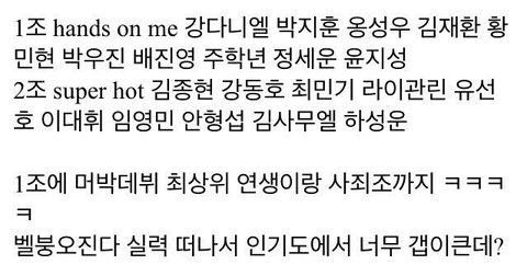 요번 스포에서 사실인지는 모르겠지만 둘이 같은 팀이란 얘기도 있더라..? 흐읔 흨 흑 시...ㅠㅠㅠㅠㅠㅠㅠㅠㅠㅠ형평성 안맞는다 이런 문제가 심각하니까 스포 팀 그대로라면 조율해야되지만 난 일단은 얘네 둘이 붙었으면 좋겠어 둘이 서로 꽁냥꽁냥 꺄르르 대화해주라...투픽 하는 사람으로써 눈물 흘리며 글 쓴다...데뷔해줘....