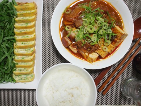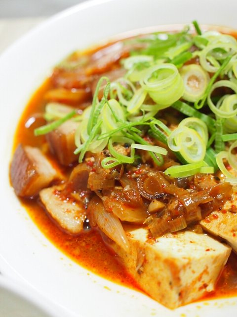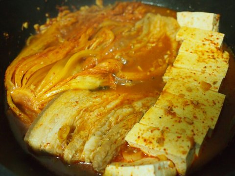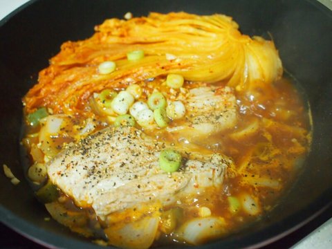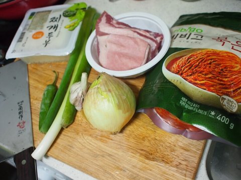 재료는 삼겹살, 묵은지, 양파, 파, 마늘, 청양고추, 두부, 고춧가루, 설탕, 소금, 후추, 간장 등.