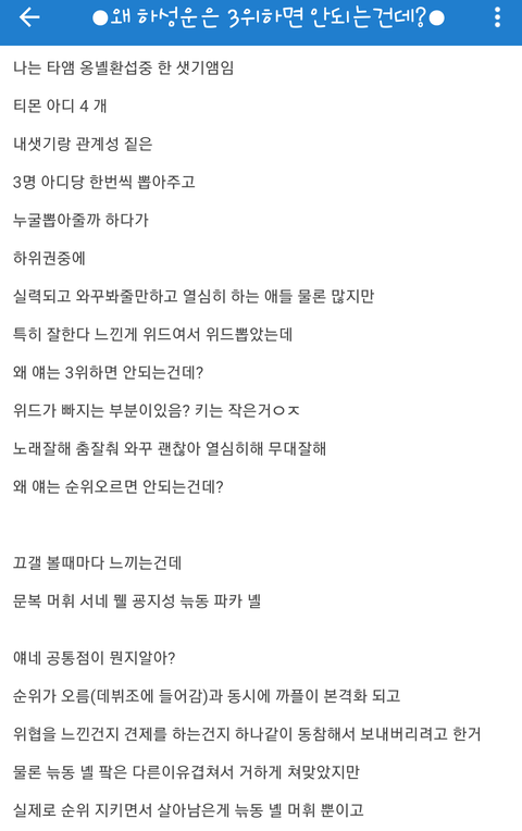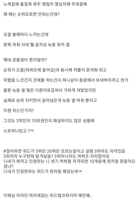 실력있어서 자리 차지한건데 왜까? 나도 타앰인데 얘 실력에비해 낮은자리에 있어서 투표했어. 내가 뽑았으니 나도 깔래? 국민이 뽑은거다 연습생은 죄없지