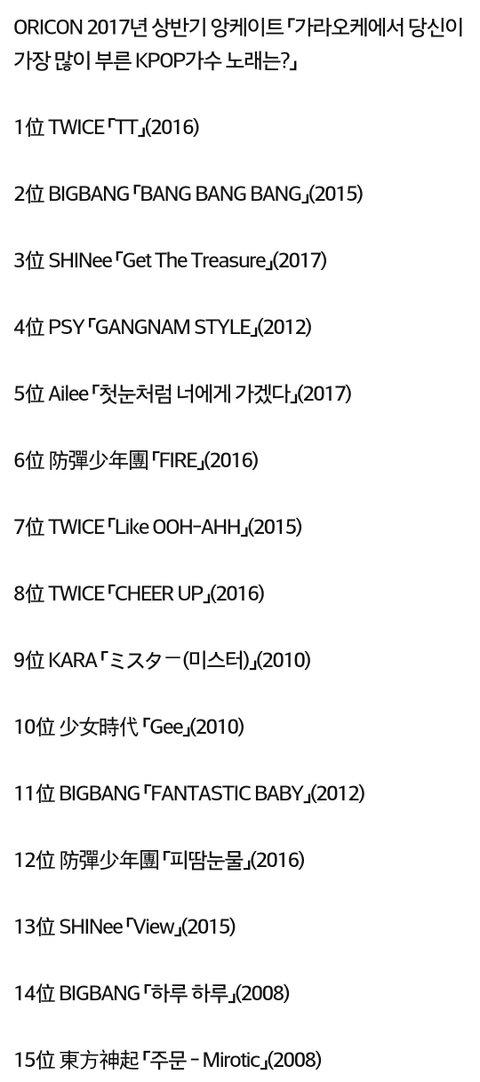 2017년 상반기 일본 가라오케에서 가장 많이 불린 KPOP가수 노래 순위
