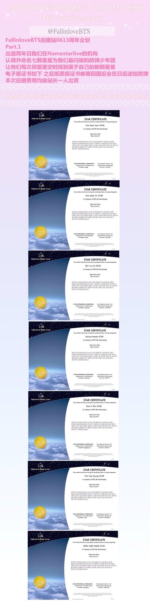 나도 확실한건 아니지만 4주년 기념해서 중국아미들이 돈 모아서 7개별 사서 방탄 이름 지어줬다는거 현실이야?? 진짜라면 대박이겠다ㄷㄷhttps://twitter.com/soymlk_03/status/873156269724413952♡하트빼고 들어가봐