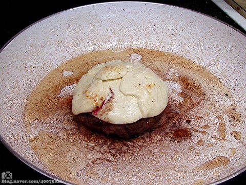 팬에 기름 살짝 두르고 패티를 굽다가, 뒤집어서 치즈를 듬뿍 올리고 뚜껑을 닫아서 마저 굽습니다.