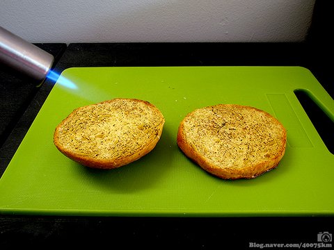 패티가 구워지는 동안 빵을 살짝 토스트해서 바삭거리는 식감을 주고, 소스나 육즙에 빵이 질척해지는 것을 막아줍니다.