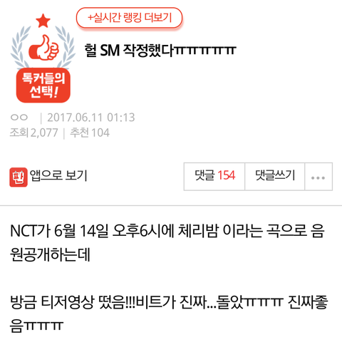 주민들 진짜 수고했고 뿌듯하다ㅜㅜ 순위 더 올리자!! 파이팅!! 그리고 컴백하면 이것보다 127127배로 더 열심히 스밍 돌리잨ㅋㅋㅋㅋ 사랑해 엔시티와 주민들